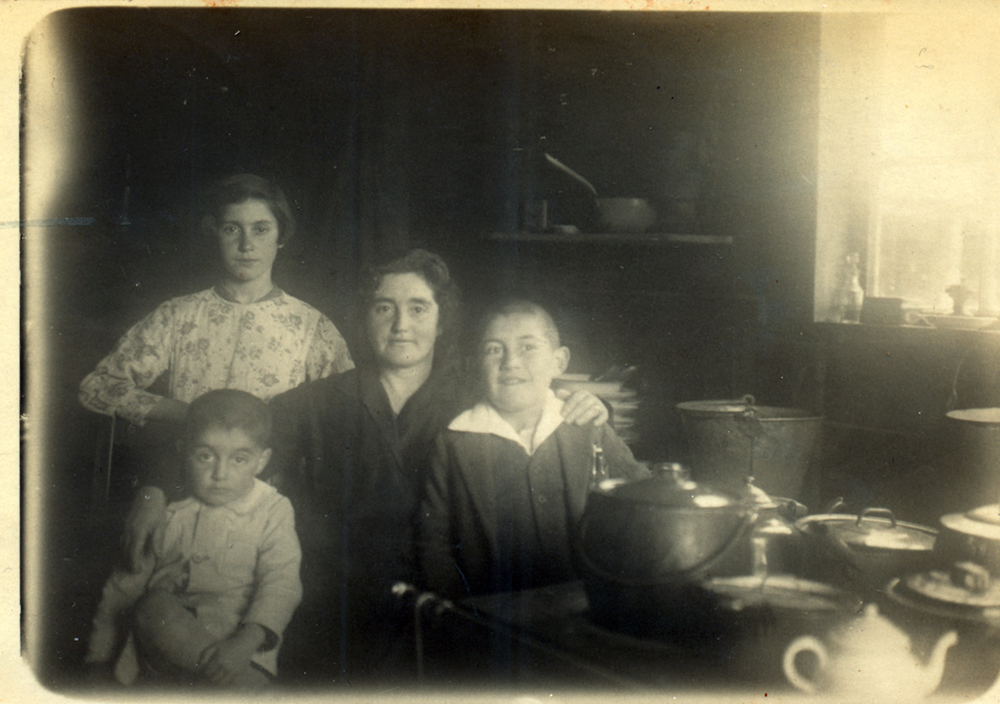 Mi madre Lucinda Bahamonde, 1930. Fotografía de Héctor Cárdenas Bahamonde. "La joven de pie es Lucinda Bahamonde, madre del donante, nació el 11 de agosto de 1917 y falleció el 28 de julio de 2008. La fotografía fue tomada en la cocina de la casa de Achao, también aparecen Pilar y los niños Beto y Raúl".
