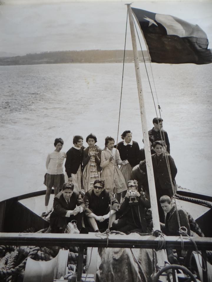 [Fotografía. 1963: primera gira de estudios de estudiantes de Palena y Valle California hacia Santiago y otras ciudades, acompañados por el profesor Roberto White Gesell y señora Julia Watson. Obtenida de archivo ciudadano en facebook: Palena en Fotos]