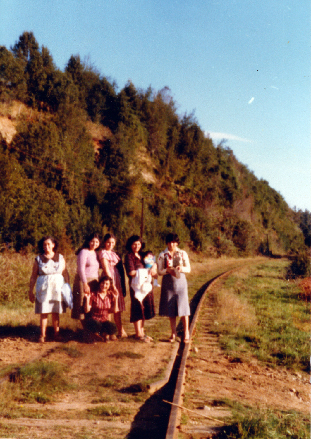 [Fotografía: Amigas posando (Ana Muñoz, 1980). Amigas, primas y hermanas posando junto a línea del tren en Fresia. Aparecen: Erna Muñoz, Ida Gutiérrez, Jeannette Muñoz, María Gutiérrez, Elena Gutiérrez y Ada Delgado. Obtenida de Memorias del Siglo XX https://www.memoriasdelsigloxx.cl/601/w3-article-129796.html ]