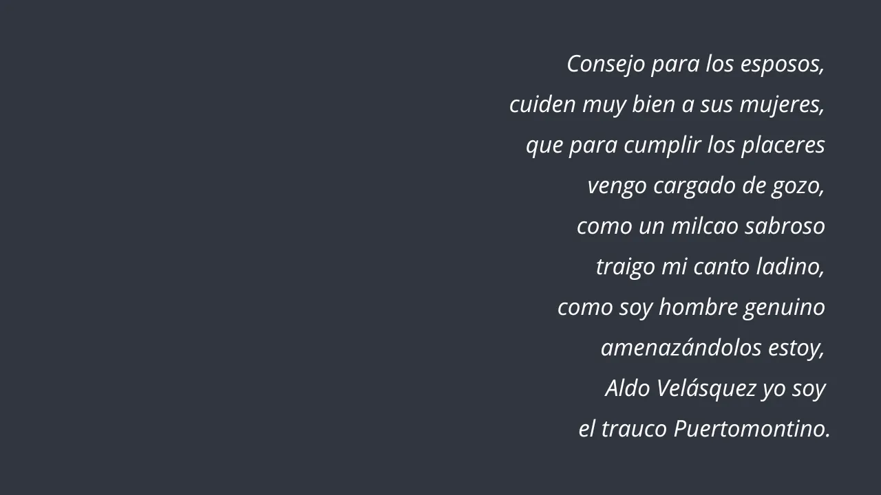 El Canto a lo Poeta es un arte que da igual relevancia al canto que a la poesía. Y entonces los textos son fundamentales, ¿ya? Y nosotros además trabajamos bajo las fórmulas poéticas antiguas, tradicionales. La décima, la cuarteta, el romance…