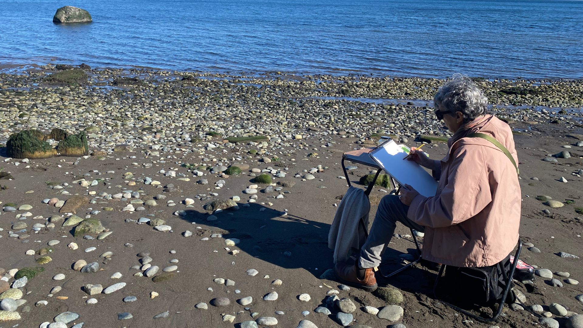 Esa mañana, entre el vaivén de la marea, pinta dos tocones en acuarelas distintas. Dice que su propósito es alcanzar cincuenta obras hechas in situ y trece más a partir de fotografías, para una próxima exposición en el Centro Cultural Bosque Nativo de Puerto Varas, que se realizará hasta el 17 de enero de 2026. Saca los pinceles de la arena, pliega la mesa, guarda el piso. Emprendemos el regreso. En el camino, encontramos la gruta de agua: está llena de basura. Nos miramos y, sin decir mucho, nos ponemos manos a la obra. Recolectamos las botellas plásticas que flotan, las metemos en una bolsa y las dejamos en un contenedor. Luego seguimos rumbo a Puerto Varas.