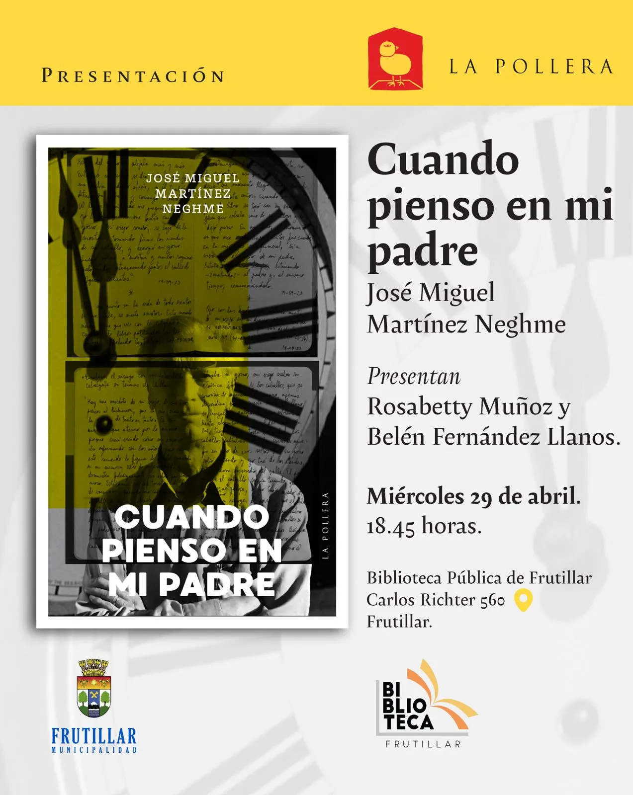 En la región de Los Lagos, el libro será presentado por la poeta Rosabetty Muñoz y la escritora Belén Fernández Llanos el miércoles 29 de abril a las 18.45 horas en la Biblioteca Pública de Frutillar (Carlos Richter 560).