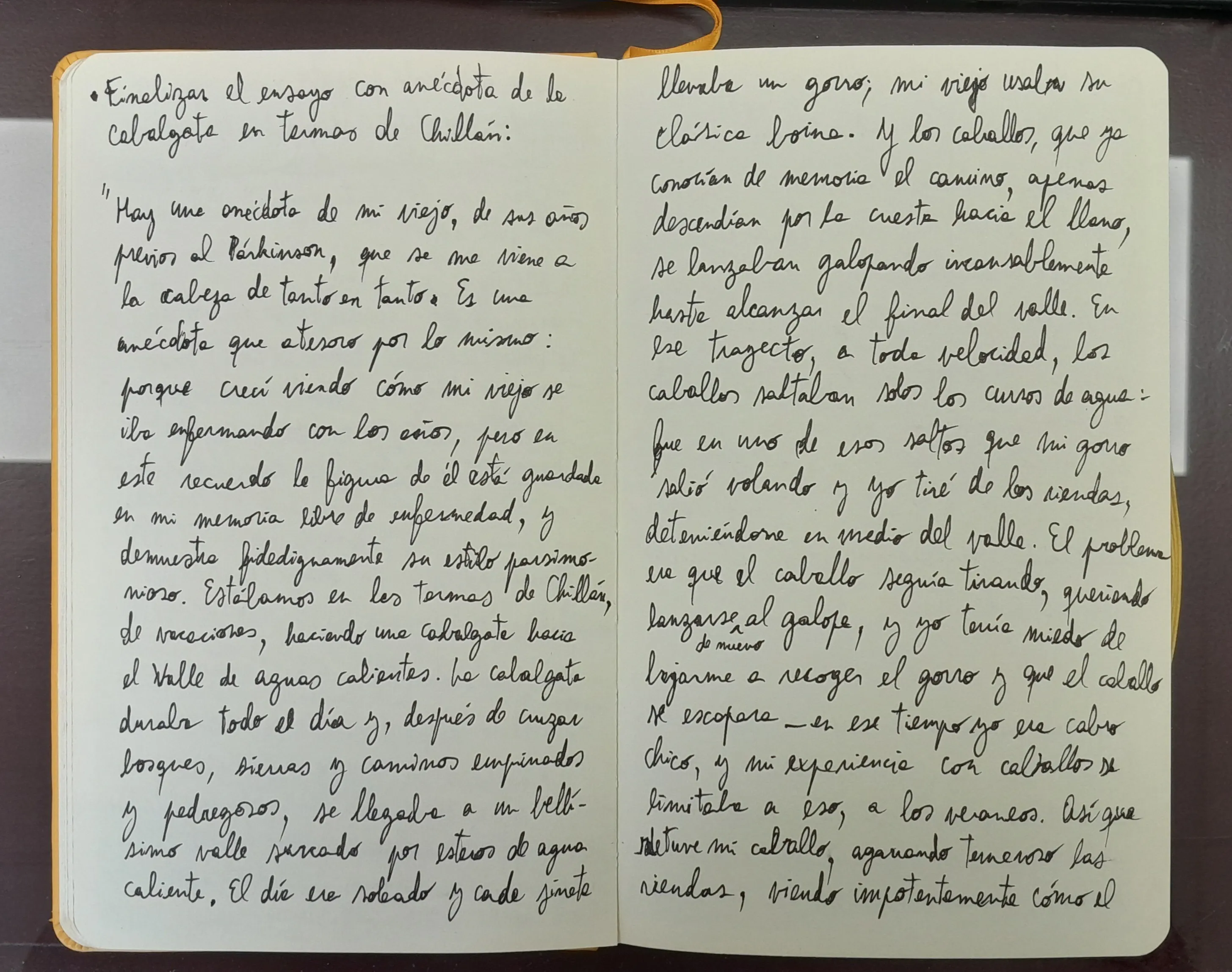 Tengo muchas libretas, siempre ando con una. Pero además tengo cuadernos de proyectos literarios, uno por cada libro que he escrito. Y este cuaderno amarillo, que tengo acá en la mesa, es el de Cuando pienso en mi padre y está exclusivamente pensado para la escritura de los ensayos de este libro. Aquí los iba planificando, porque antes de lanzarme a escribir planifico mucho, tomo muchos apuntes de ideas. Y después de tener el texto más o menos delineado, me siento a darle orden y lo paso al computador y ahí lo voy reordenando hasta que toma su forma definitiva.