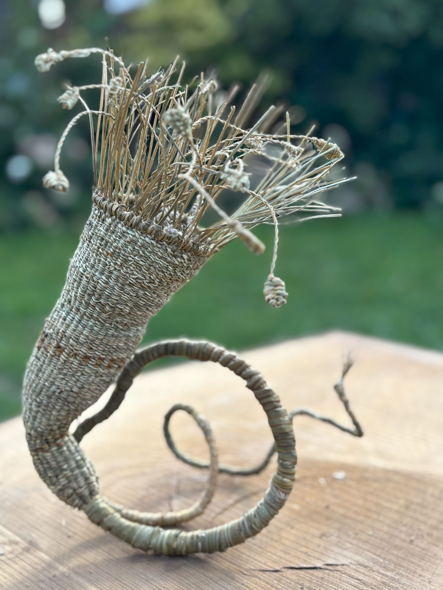 Y ahí fue cuando nació Lafquen Kürruf, me puse a tejer con técnicas textiles una cosa tridimensional, arte textil contemporáneo. Ahora incorporo el boqui, que es un boqui que tenemos acá en la cordillera de la costa, y además la manila. Empecé a hacer estas cosas más tridimensionales que fueran capaces de pararse por sí mismas y hablar así un lenguaje.